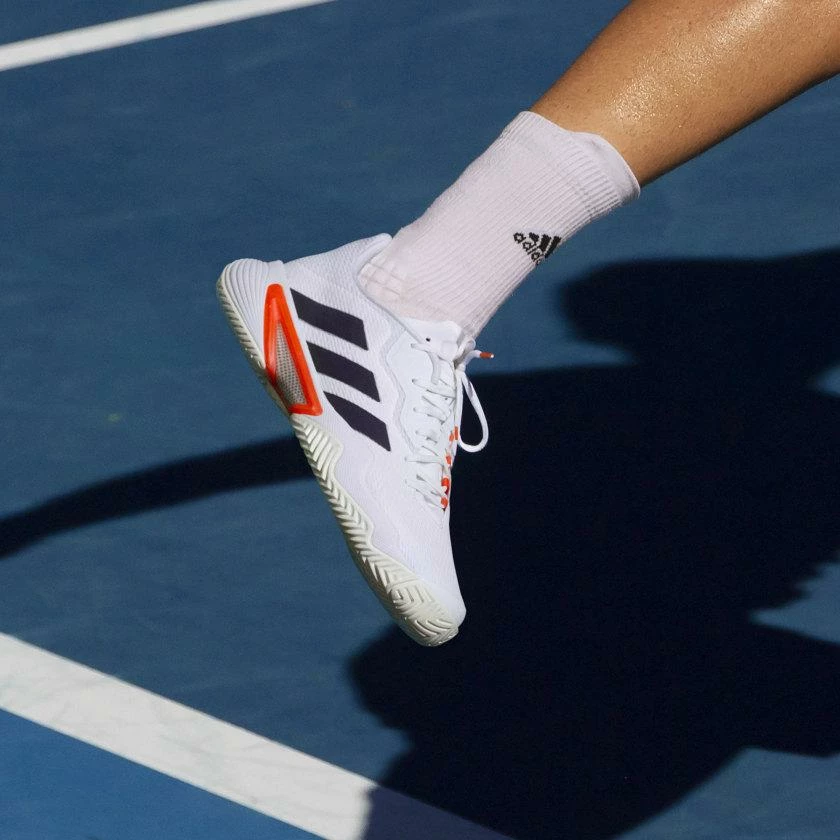 Without control, there are no guarantees on the court. adidas Barricade tennis shoes are back to help you dominate. The intuitive lacing system on these adidas Barricade tennis shoes locks you in by pulling down the neoprene tongue to match your foot shape. A Geofit system in the heel fills the remaining gaps to complete the connection. Underneath, a cushioned Bounce midsole and TPU midfoot shank keep every step comfortable and stable. That bold adidas wordmark on the medial side is made from tough RPU to combat wear from foot drag making these a worthy update to the adidas Barricade tennis shoe series.