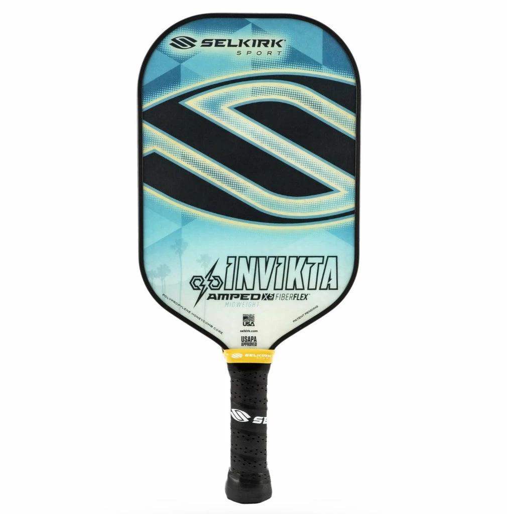 The Selkirk Amped Invikta Midweight Pickleball Paddle brings an increased sweetspot size compared to traditional elongated paddles. The large sweetspot and elongated surface area, matched with a long handle provide full power and forgiveness – all with the control of the Polypropylene X5 Core Technology and the FiberFlex fiberglass surface. It is the creation of National Champion Tyson McGuffin, and is the paddle of choice for conquerors of the court! The Invikta’s midweight version averages 7.9 – 8.4oz giving you extra power for hard drives from the baseline. The 2020 series of paddles come with fresh, new graphics and improved reliability, and retain the power, control, and feel that you have come to love.